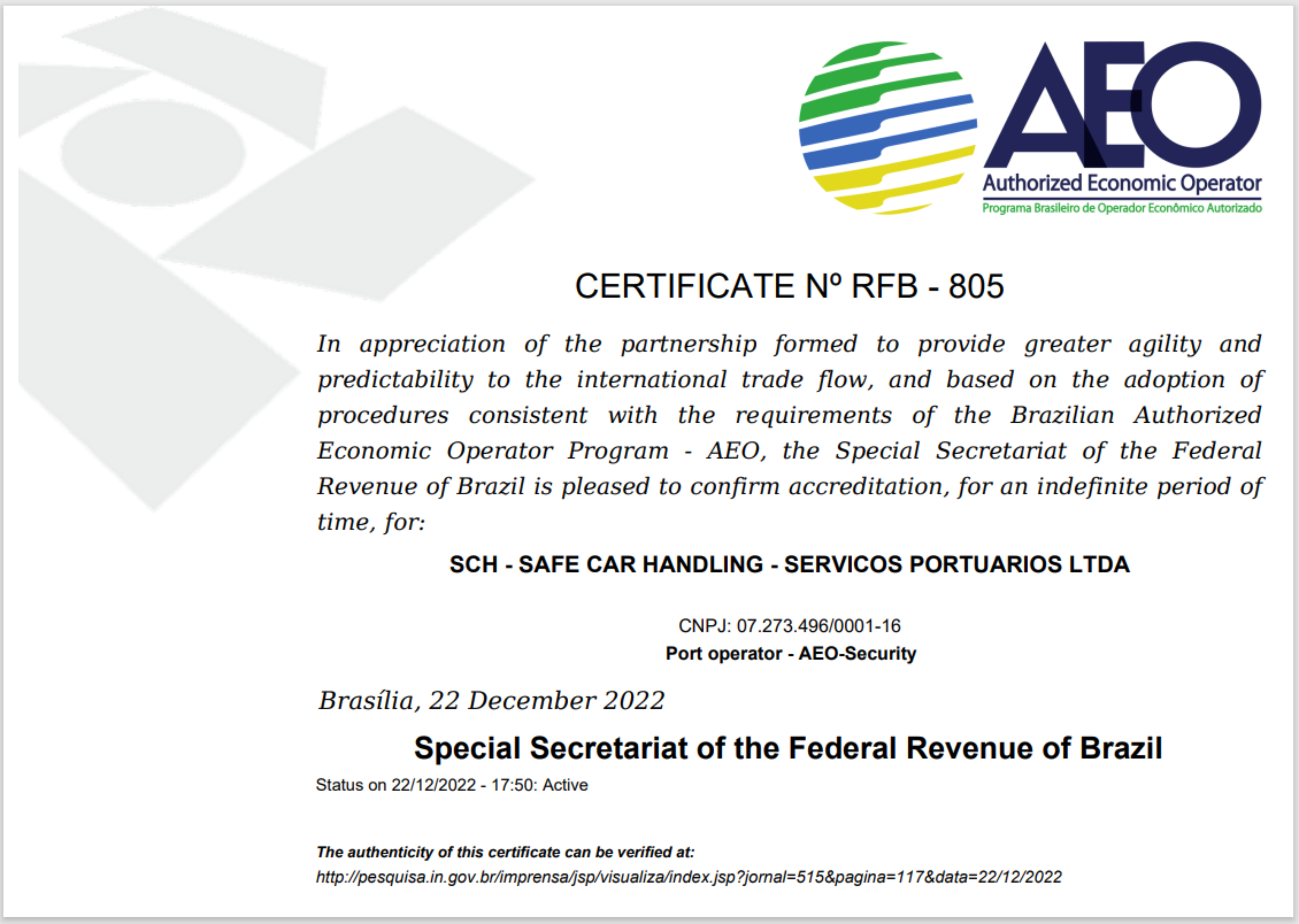 Após atestar o cumprimento de todos os requisitos e critérios, estando em Conformidade Aduaneira e de Segurança da Cadeia Logística, recebeu da Receita Federal do Brasil (RFB) o Certificado de Operador Econômico Autorizado - OEA (Authorized Economic Operator - AEO) concedido pelo governo brasileiro para empresas de comércio exterior que apresentem baixo risco.